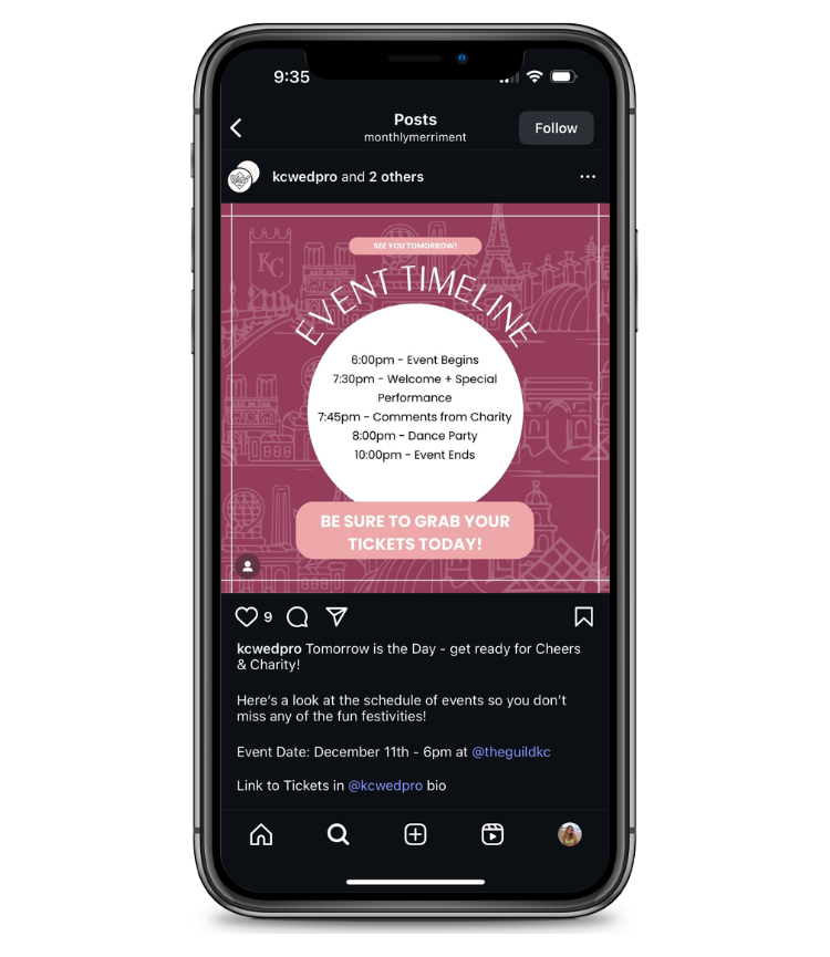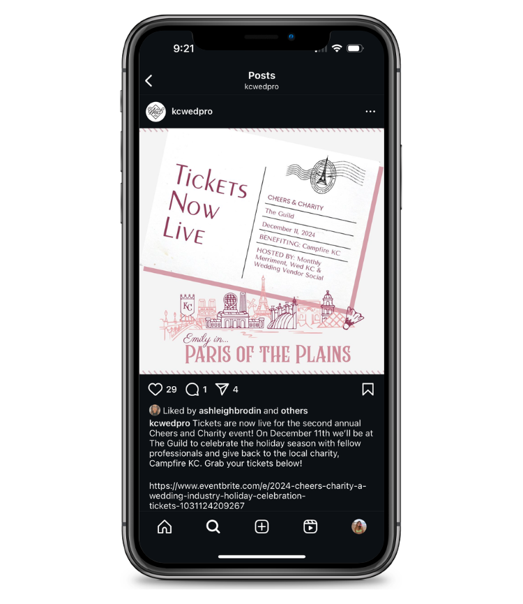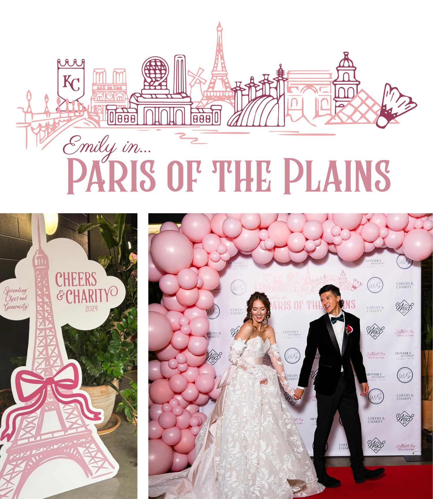 For Cheers + Charity, I developed the event’s visual identity once the theme and branding were established. I created a custom blended skyline connecting Kansas City and Paris by hand-drawing iconic landmarks in a cohesive style, and designed coordinating icons. From there, I produced social media posts and stories for sponsors and donors, highlighting vendors, sponsors, the charity, and ticket sales. My designs were also applied across event signage, stationery, backdrops, photoshoots, and overall event branding to create a polished, cohesive experience.