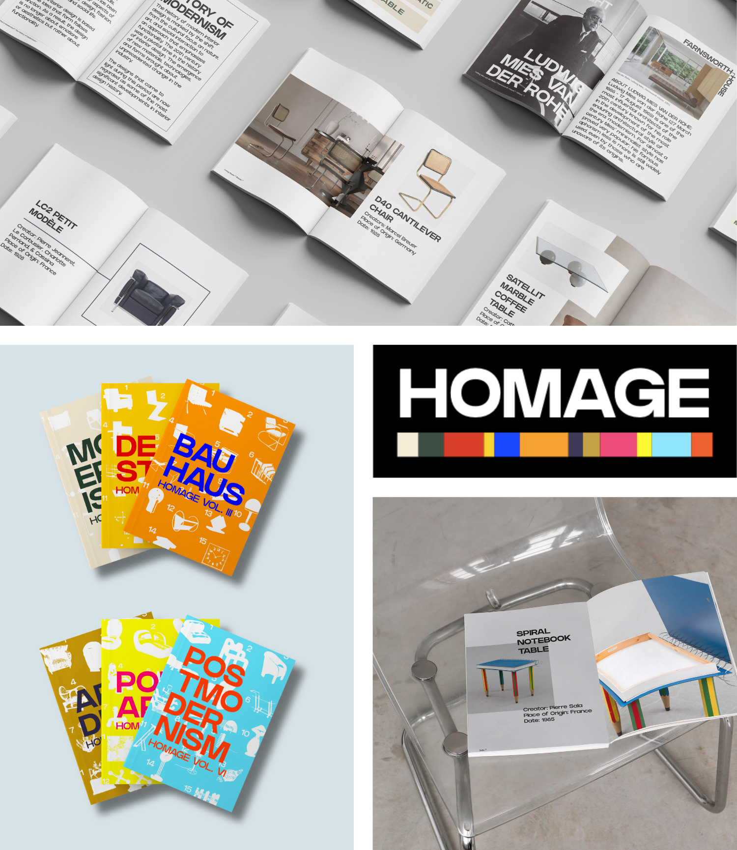 For the HOMAGE series, I designed a cohesive six-book collection that explores key 20th-century design movements. Each book features a consistent layout, carefully curated images and text, and a unique two-color palette reflecting the interior design trends of its movement. The series highlights 22 key figures, 85 iconic pieces of furniture and decor, and over 500 hours of research across 248 pages, inspiring homeowners to incorporate historical design elements while educating them about each movement’s defining characteristics.