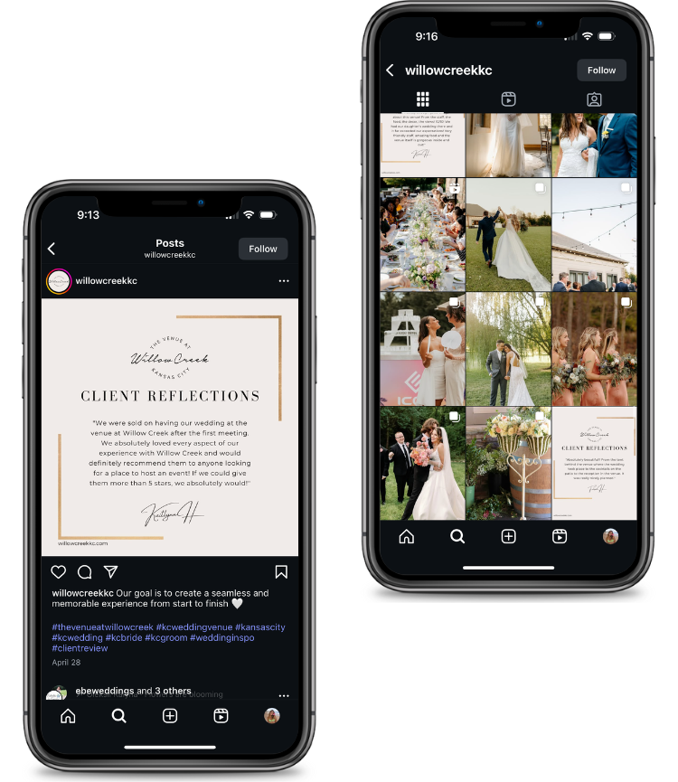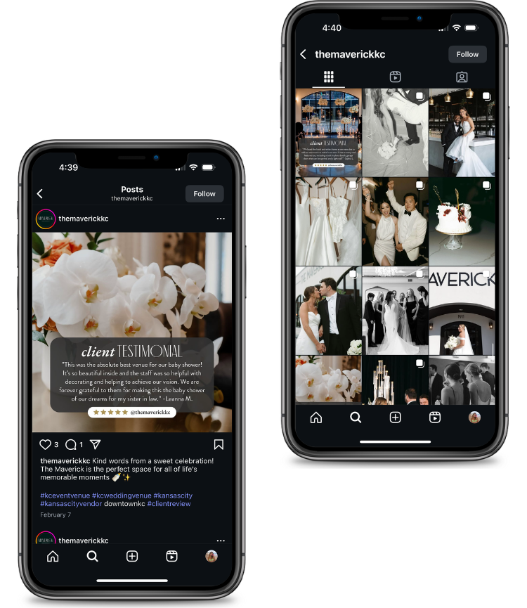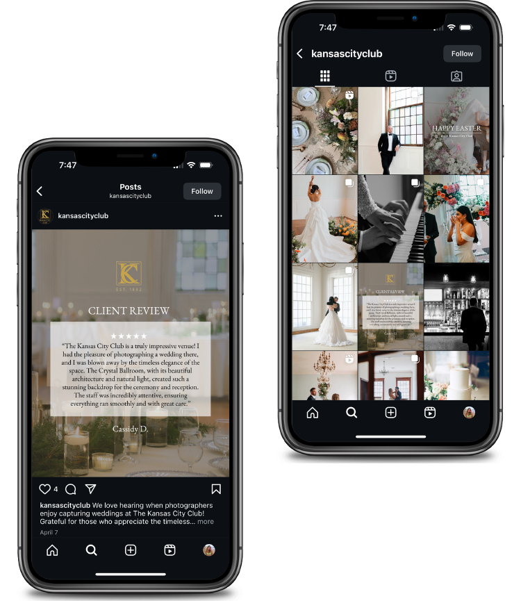 I created monthly social media graphics highlighting client reviews to showcase the venue’s exceptional events and experiences.