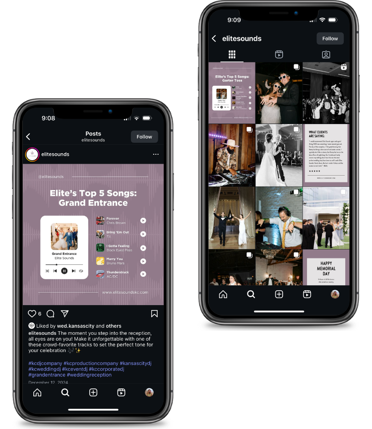 I designed monthly social media graphics featuring Elite’s Top 5 songs, client reviews, and holiday posts to highlight their high-energy event experiences.