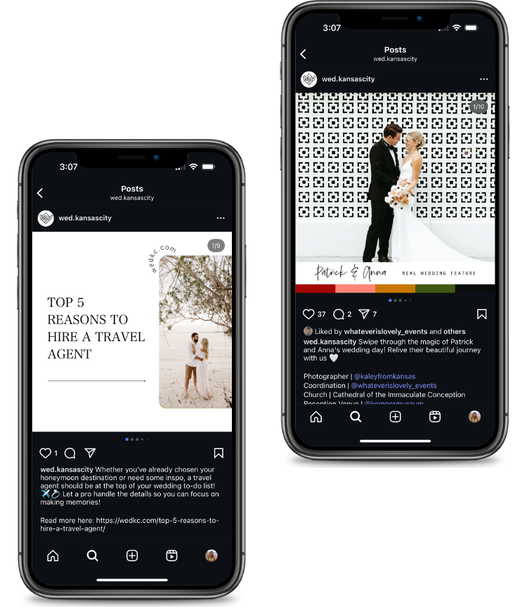 I created monthly social media graphics including article carousels, wedding feature carousels, and event graphics to engage and inspire their audience.