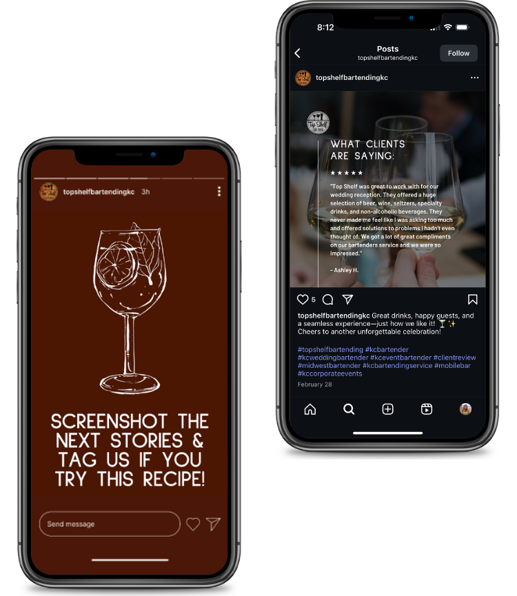 I designed monthly social media graphics including #TipsFromTopShelf, client reviews, drink-of-the-month carousels, and holiday-themed posts to engage and inform their audience.
