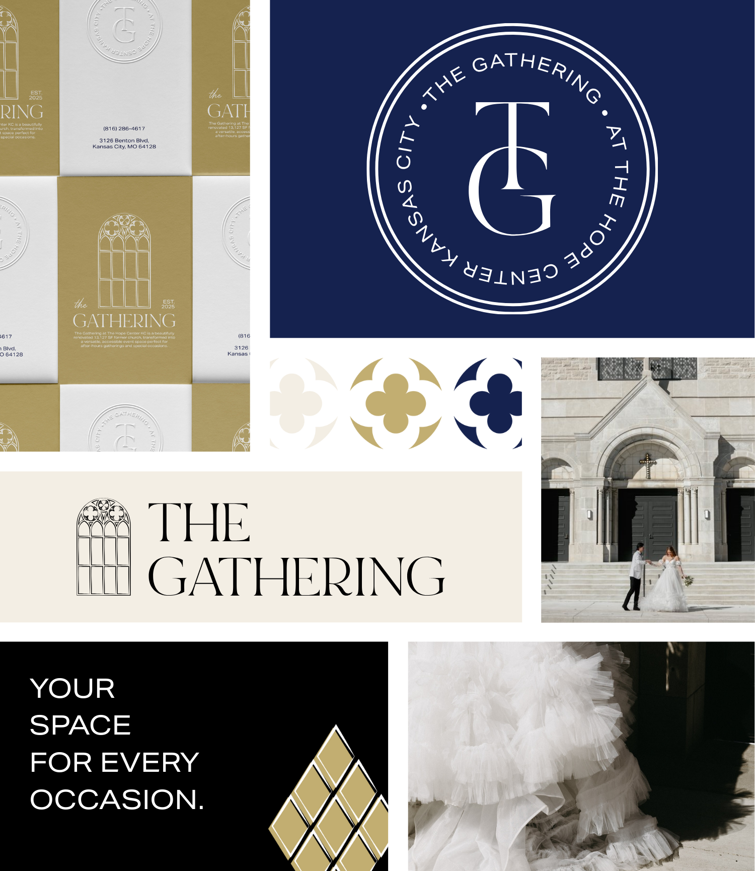 The Gathering KC sought an elegant brand identity that honored the history and revival of its former church space while remaining versatile for all types of events. Inspired by the venue’s striking interior, the branding features a navy and gold color palette that mirrors the deep blue ceiling and ornate gold accents. Custom icons were designed using shapes found in the building’s architecture — from its arched windows to detailed stone carvings — creating a cohesive visual connection to the space. The result is a refined yet approachable identity that reflects The Gathering’s spirit of community and timeless beauty.