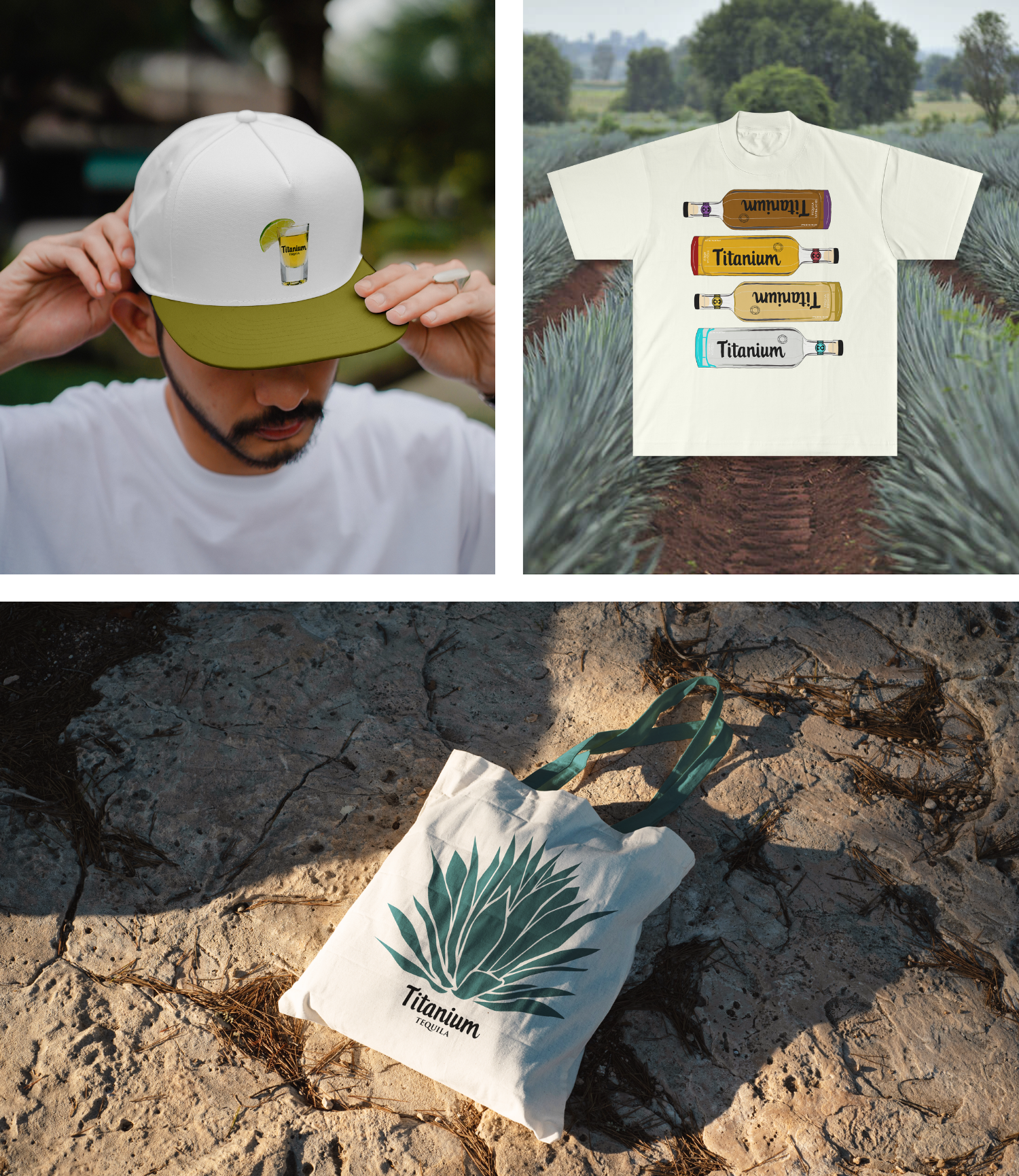 Titanium Tequila approached me to create merchandise designs, granting full creative freedom with the only requirement that they be all-ages and gender-neutral. To reflect the brand’s dedication to quality and heritage, I incorporated the Highland Blue Agave plant into one design and hand-illustrated the bottles and shot glasses with realistic detail. These designs were applied across a variety of merchandise — including t-shirts, hats, towels, bags, and sweatshirts — for sales, giveaways, and events, capturing the brand’s craftsmanship and timeless appeal.